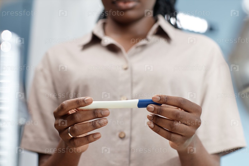Руки чернокожей женщины смотрят на тест на беременность с положительным результатом в ванной