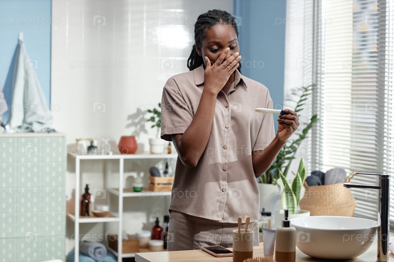 Удивленная чернокожая женщина держит тест на беременность в ванной
