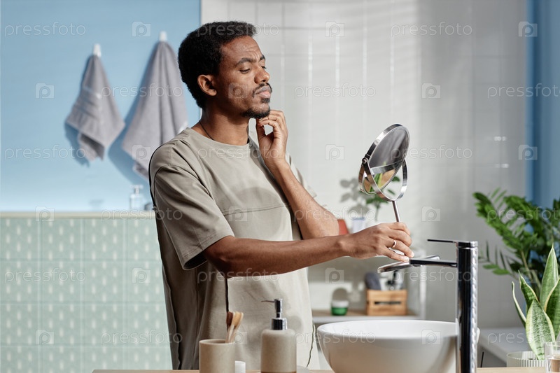 Чернокожий мужчина прикасается к лицу, ухаживает за бородой и смотрит в зеркало в ванной