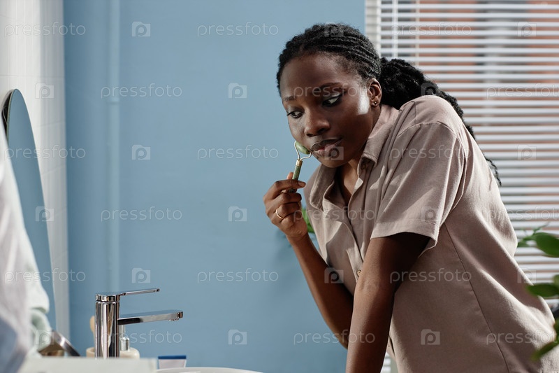 Черная женщина, заботящаяся о коже Массаж лица с помощью нефритового ролика дома
