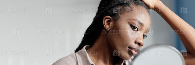 Header Image of Черная женщина с макияжем смотрит в зеркало во время рутины самообслуживания в ванной
