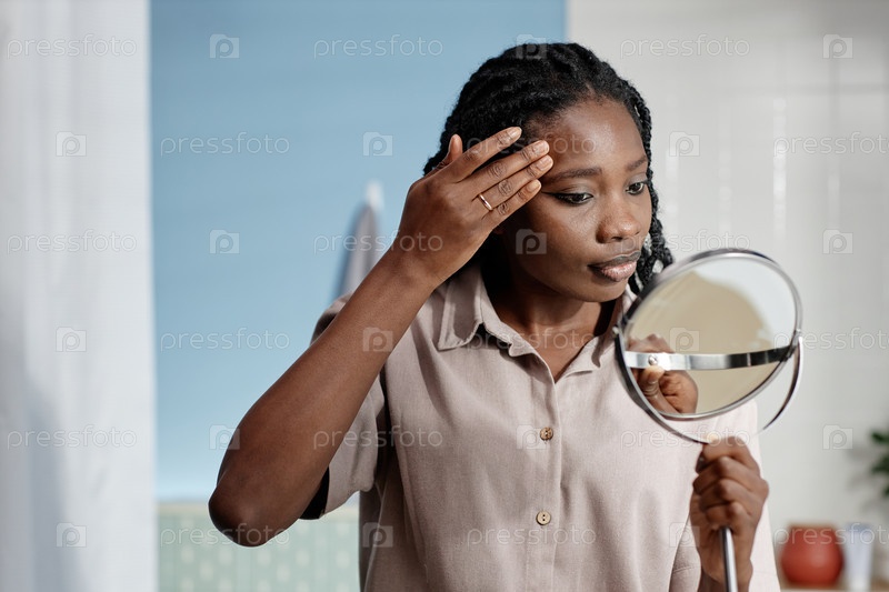 Черная женщина наносит макияж, держа зеркало в ванной