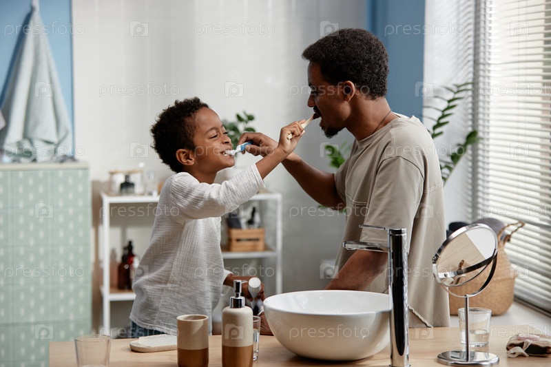 Игральный черный мальчик чистит зубы отцов с помощью зубной щетки в ванной