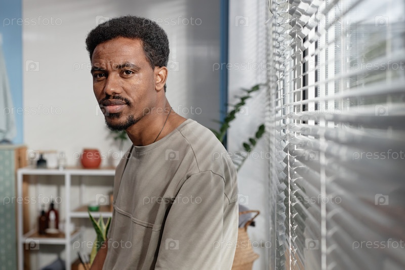 Черный мужчина со здоровой кожей, стоящий у окна во время ритуалов самообслуживания в ванной