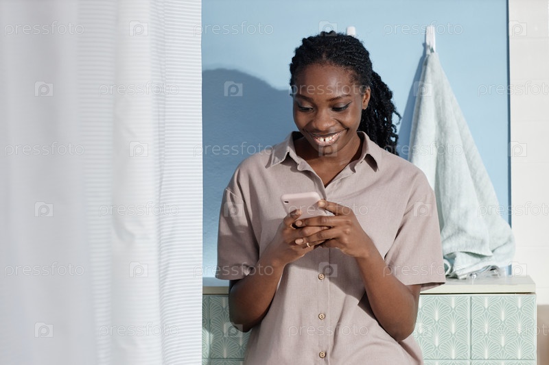 Улыбающаяся чернокожая женщина пользуется телефоном во время обмена текстовыми сообщениями в помещении