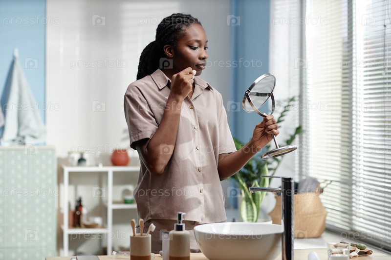 Чернокожая женщина ухаживает за кожей лица, используя гуа ша во время просмотра в зеркале дома