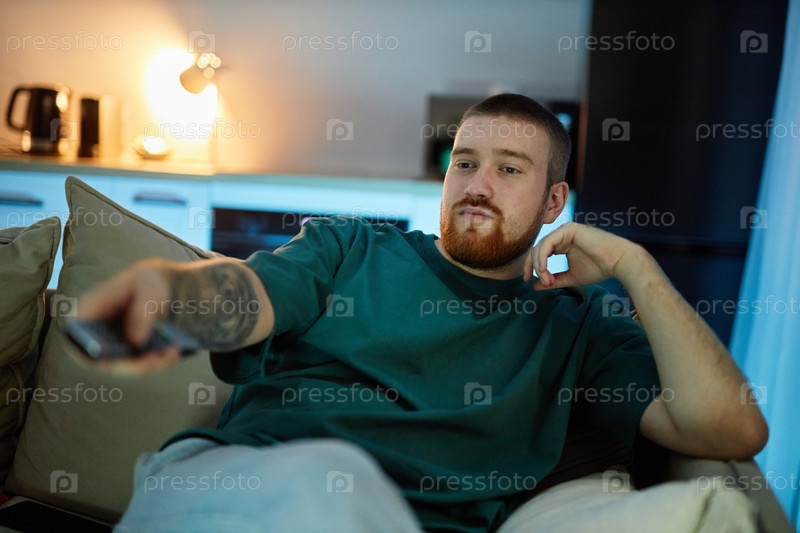 Бородатый мужчина сидит на диване, держит пульт телевизора в тускло освещенной гостиной