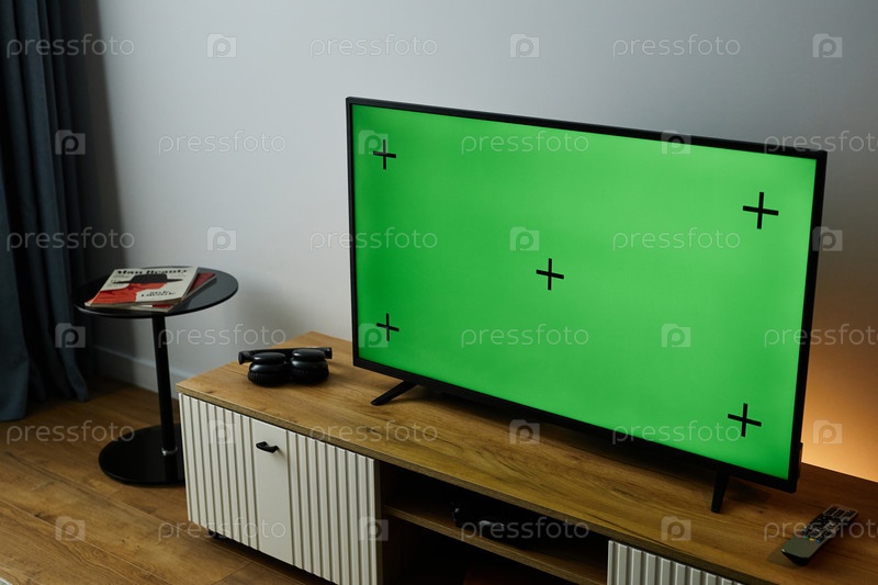 Большой угол телевизора с зеленым экраном Mock Up на телевизионной стойке