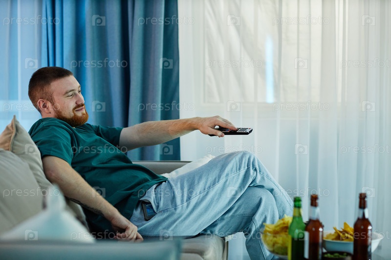 Забавный мужчина смеется, смотрит телевизор сидит на диване держит пульт