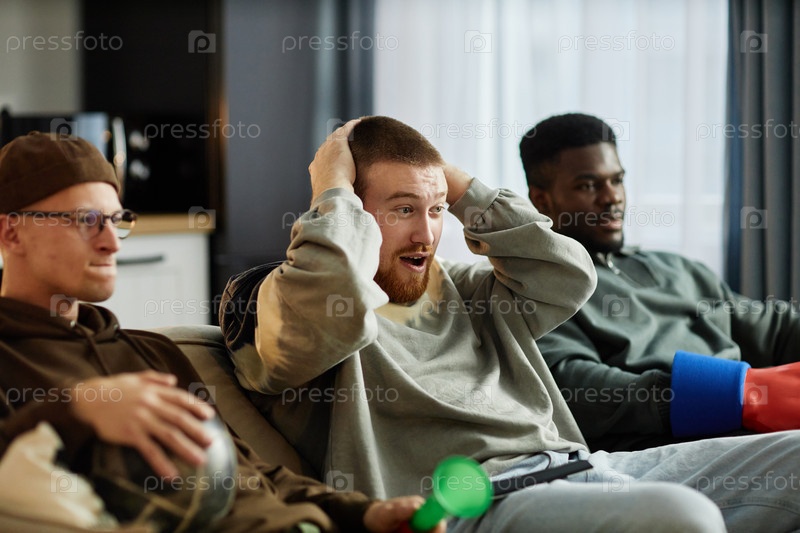 Шокированный человек как спортивный фанат, смотрящий игру по телевизору с друзьями