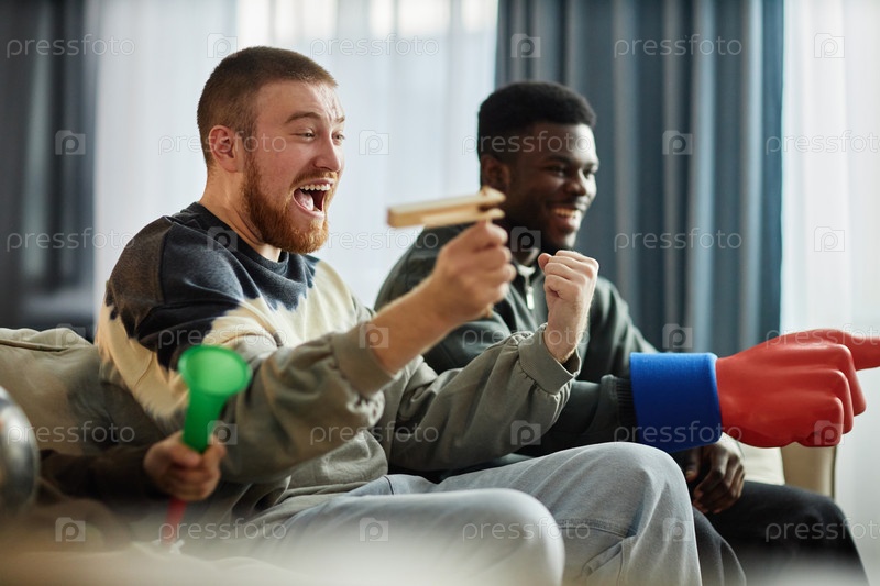 Человек кричит смотреть игру по телевизору удерживая спортивные фанаты аксессуары шумники