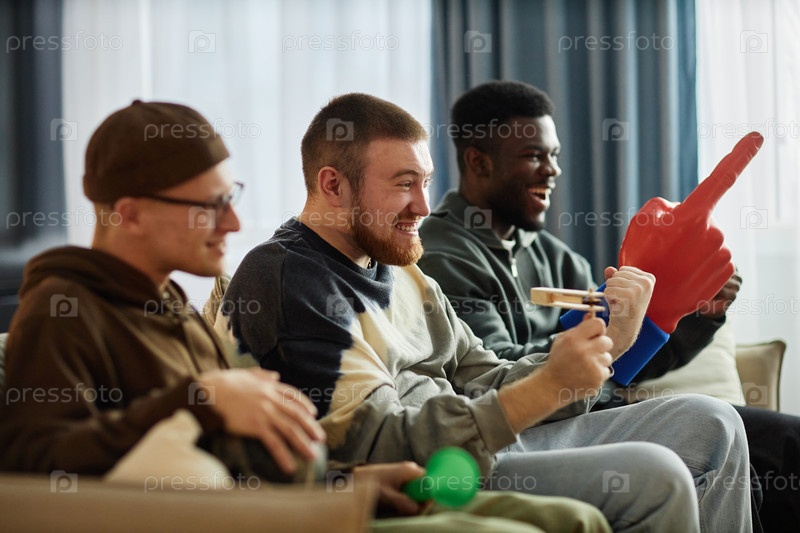 Друзья смотрят игру, сидя на диване в ряду