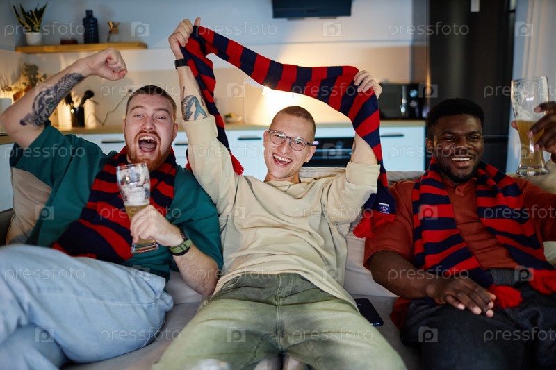 Мужчины смотрят спортивный матч по телевизору, болеют за аксессуары в цветах команды