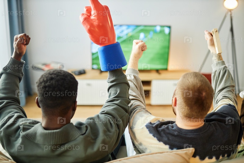Обратный взгляд Друзья смотрят футбольный матч по телевизору