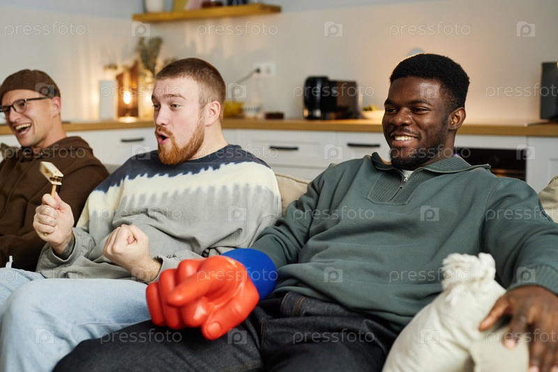 Улыбающийся чернокожий мужчина смотрит спортивный матч по телевизору сидит на диване с друзьями