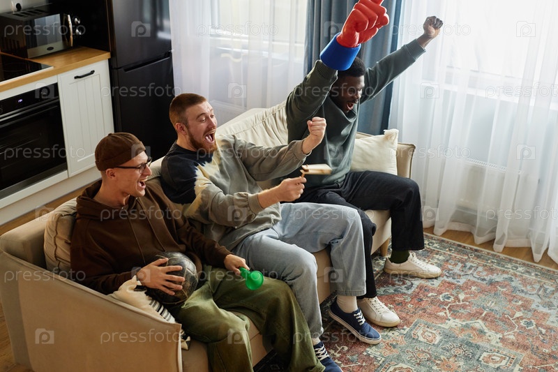 Группа друзей, смотрящая игру по телевизору, празднующая победу команды и кричащей группы