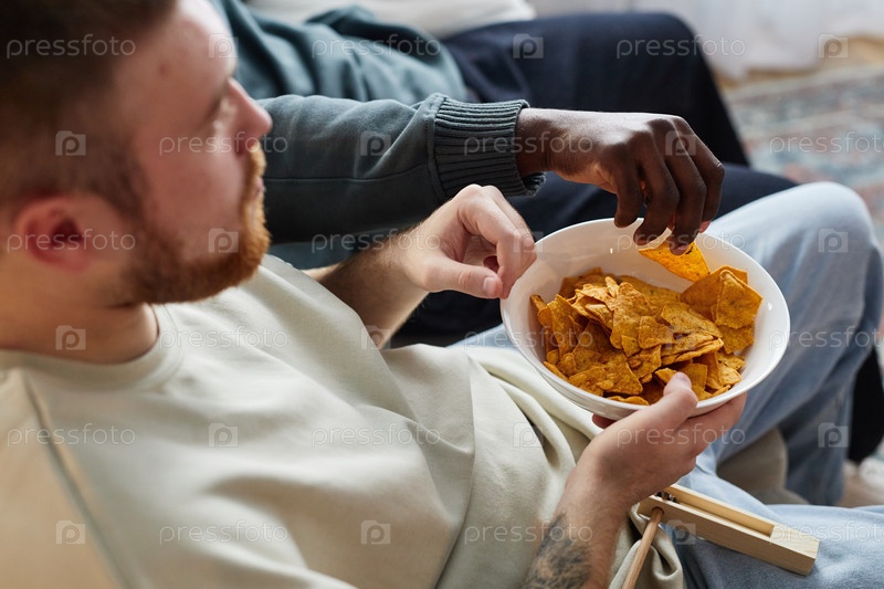 Человек, держащий миску с чипсами закуски смотреть телевизор с друзьями