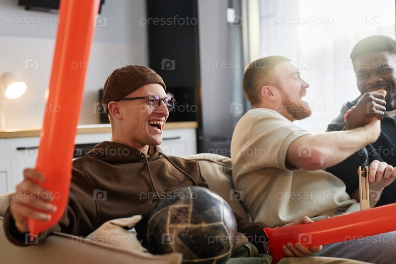 Группа счастливых друзей празднуют победу взволнованы громко смотрят игру по телевизору