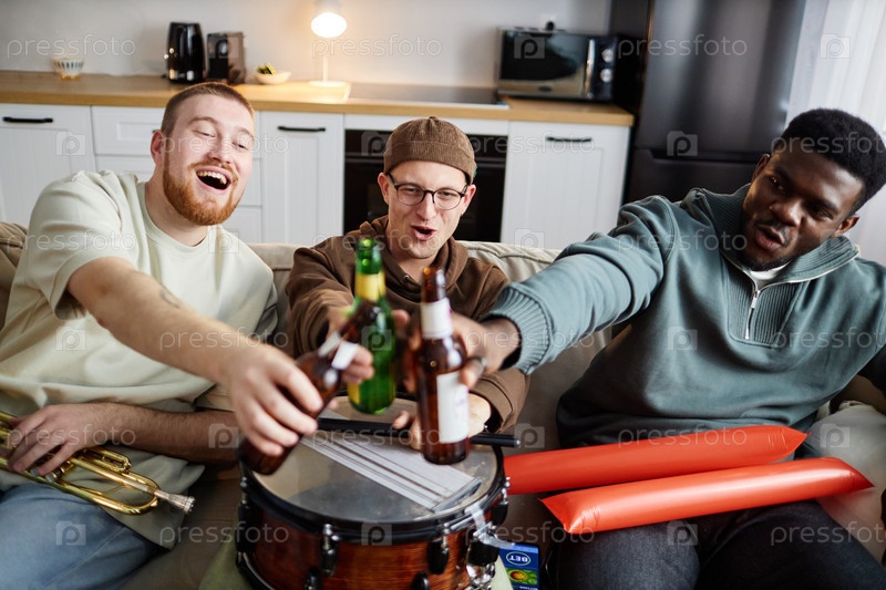 Друзья тостят с бутылками пива сидят на диване с шумеющими барабанами