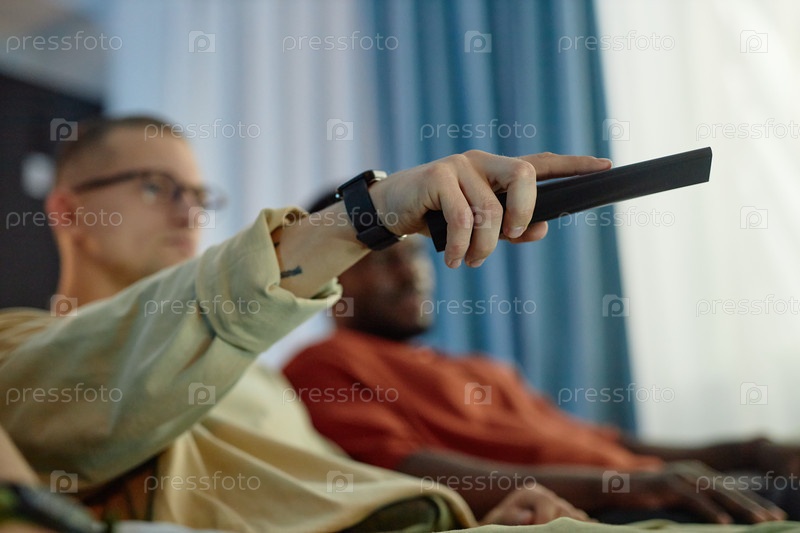 Close Up of Hand Pointing TV Remote Switching Channels Закрыть рукой указывающий на телевизор дистанционное переключение каналов