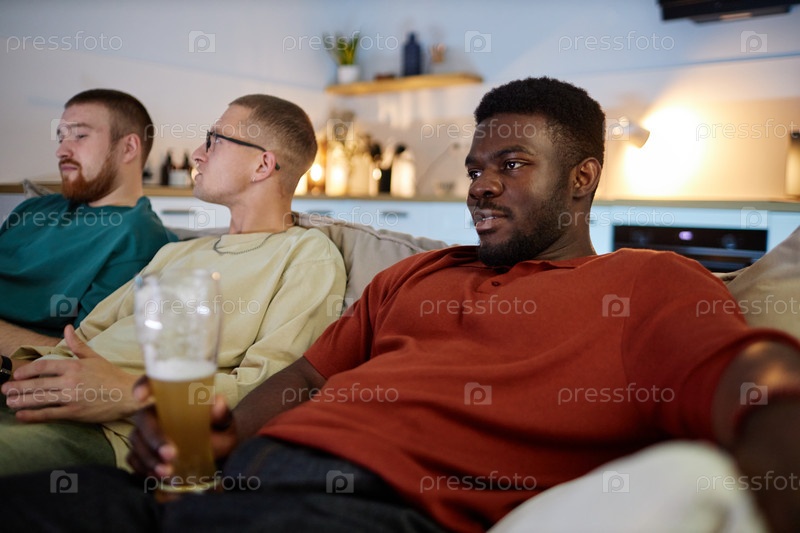 Черный мужчина сидит на диване и смотрит телевизор с напитками