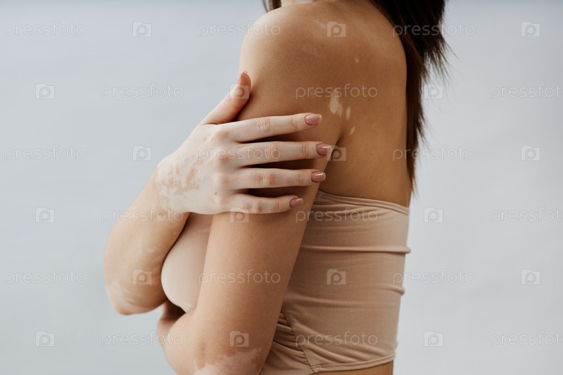 Молодая женщина с витилиго касается обнаженного плеча, позируя в белой студии