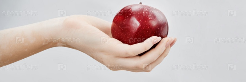 Header Image of Женская рука с витилигой держит красное яблоко против белого в студии