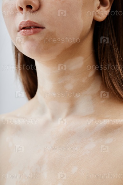 Губы и обнаженные плечи девушки с пятнами витилиго на коже, позирующей в студии
