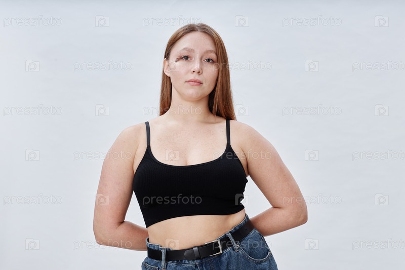 Портрет модели плюс-size с родинкой на лице, позирующей в студии во время ношения нижнего белья