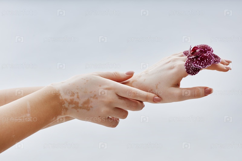 Руки девушки с витилиго касаются, держа пятнистую орхидею против белого в студии