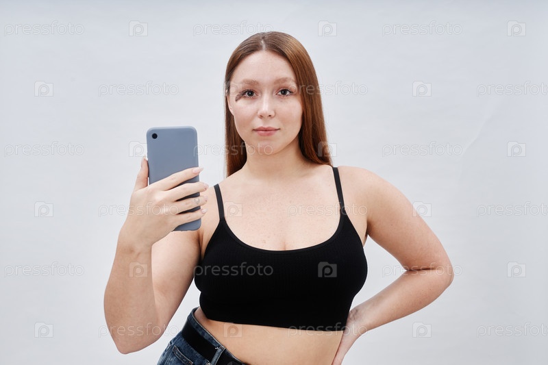 Портрет модели плюс-size с родинкой на лице, делающей селфи по телефону в студии