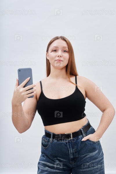 Кривая женщина с родинкой на лице делает селфи по телефону смотрит в камеру в студии