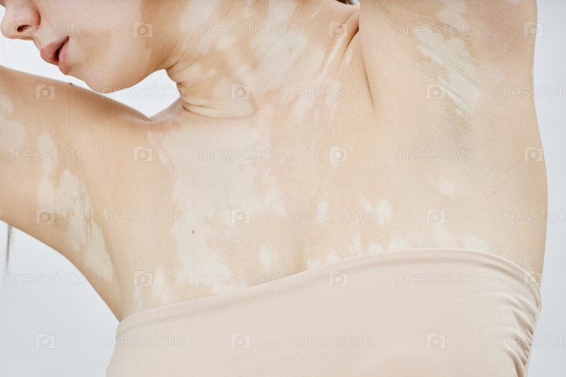 Грудь девушки с витилиго поднимает руки, позируя в студии на белом фоне