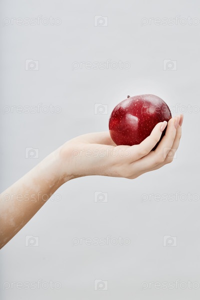 Рука девушки с витилиго, держащей красное яблоко со пятнами против белого в студии