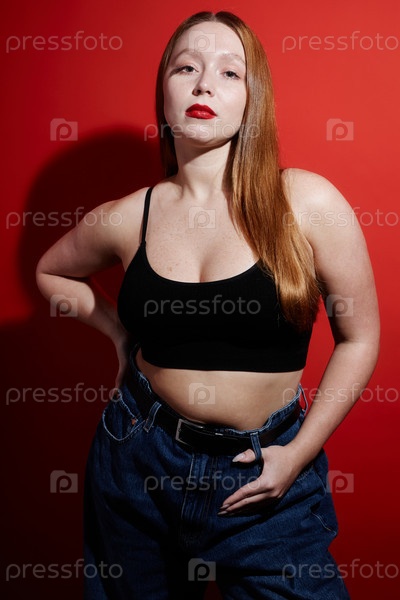 Портрет модели плюс-size с красной помадой, позирующей против красного в студии