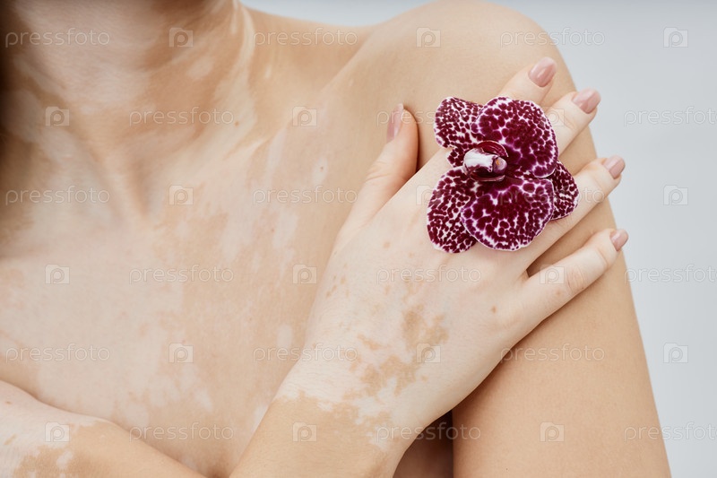 Цветок орхидеи в руке девушки с витилиго, касающейся мягкой кожи плеча и позирующей в белой студии