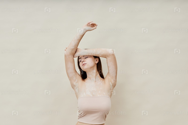 Грациозная девушка с витилиго поднимает руки, позируя на бежевой стене в студии