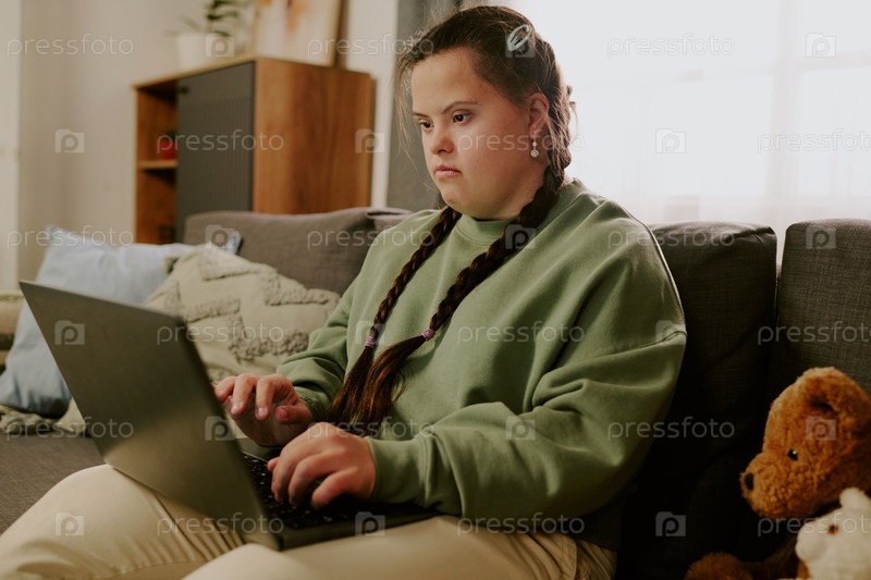 Молодая женщина с инвалидностью использует ноутбук