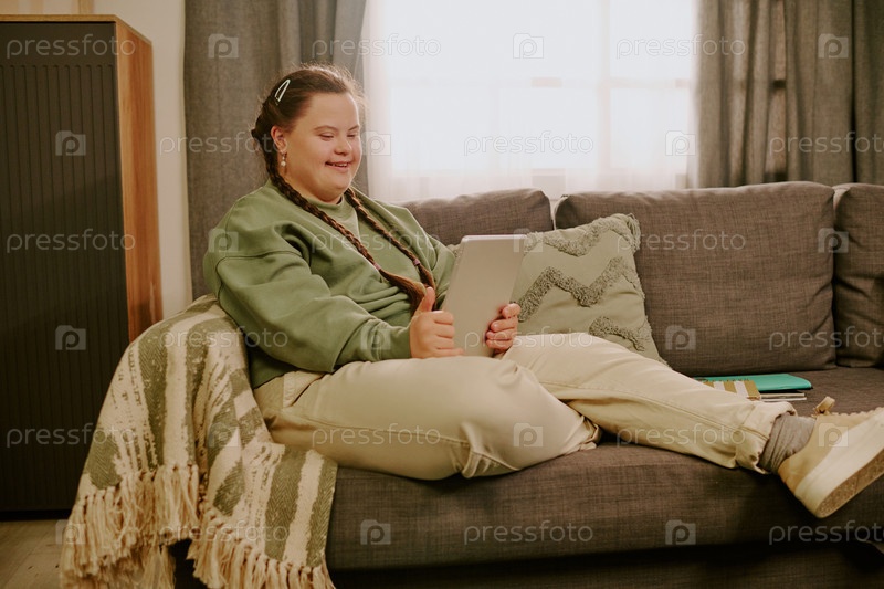Веселая девочка с синдромом Дауна отдыхает в гостиной