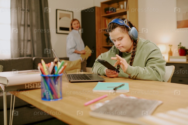 Девушка с инвалидностью выбирает плейлист на смартфоне