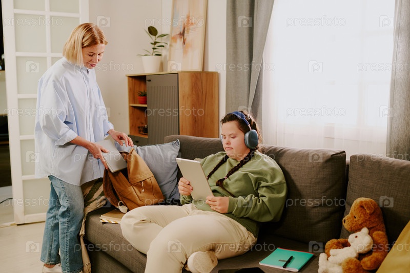 Женщина помогает дочери подготовиться к школе