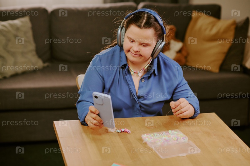 Девушка с инвалидностью смотрит на экран смартфона во время рисования