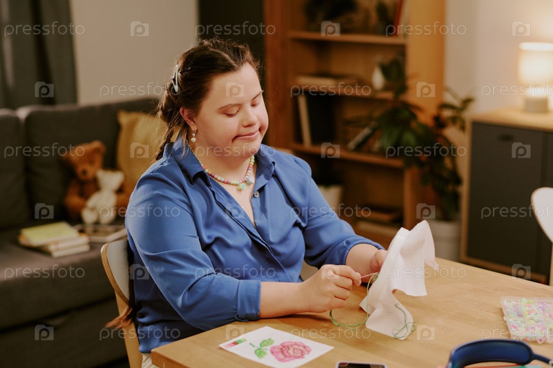 Молодая женщина с синдромом Дауна вышивает дома