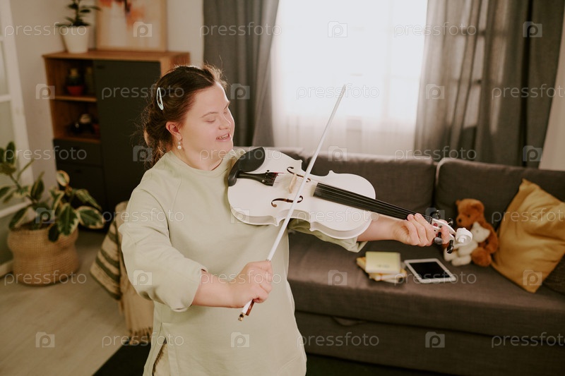 Счастливая девочка с инвалидностью учится играть на скрипке