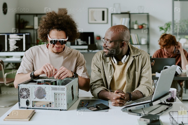 Друзья, общающиеся во время работы в офисе