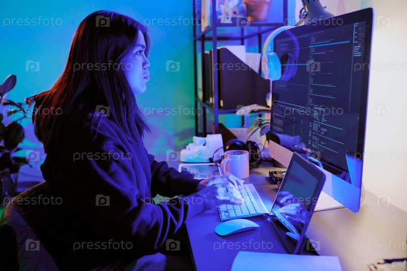 Кодирование в неоновой комнате Женщина