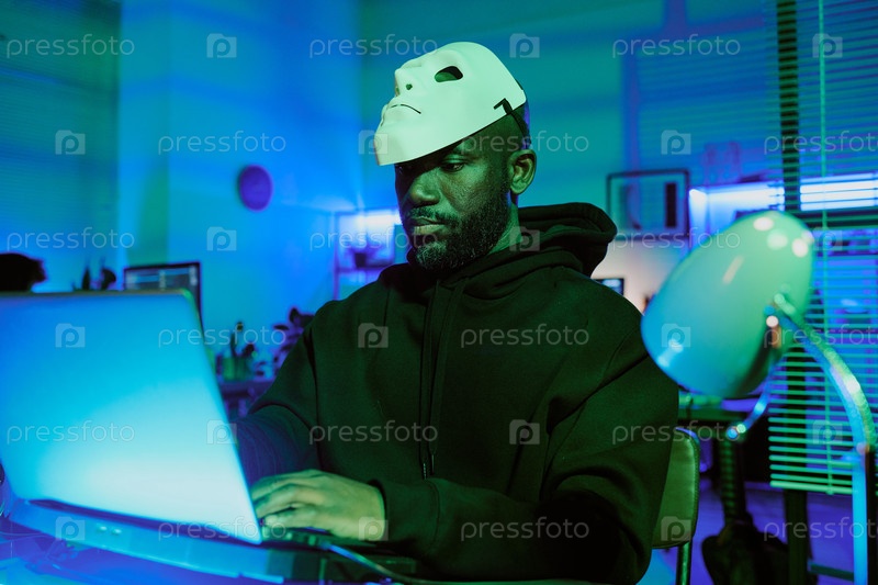 Афроамериканский хакер с маской на лбу