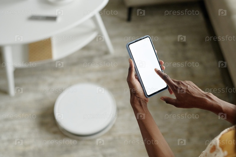 Женщина использует смартфон, чтобы включить робот-чистильщика