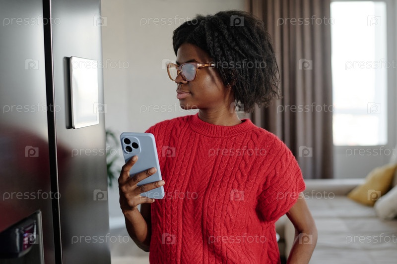 Афроамериканская домохозяйка подключает смартфон к умному холодильнику