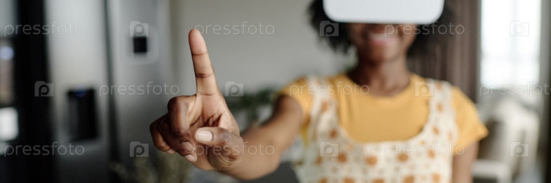 Заголовок с женщиной, демонстрирующей указательный палец во время игры в VR-игру